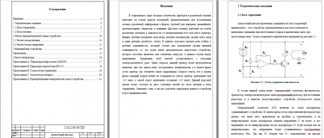 В современном мире большое количество приборов и различной техники работают на основе средств измерений, предназначенных для исследования сигнала различной информации в форме, удобной для передачи, дальнейшего преобразования, обработки и хранения. Другими словами, работают на основе различных датчиков в зависимости от предназначения того или иного прибора. Бывают датчики измерения силы ветра, датчики температуры, уровня снега, дама и даже датчики разбитого стекла. В данном курсовом проекте речь пойдет о датчике освещенности, который служит для определения уровня внешней освещенности, т.е. это будет некое автоматическое аналоговое устройство, которое способно включать или отключать нагрузку, в данном случае лампу накаливания. Управление этой лампой осуществляется с помощью электромагнитного реле. Таким образом данный прибор будет автоматически включать свет без какого-либо постороннего вмешательства, а в темное время суток прибор сам отключит лампу накаливания. Следует учесть, что в зимнее время снежный покров влияет на освещенность (летом прибор срабатывает при 110 люкс, а зимой порог включения составляет 110 люкс). Данный курсовой проект будет состоять из двух основных частей это блок питания и блок управления. Сведения о них, а так же о расчетах параметров данного устройства будут приведены ниже.