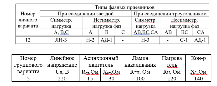 Номер группового вариантаЛинейное напряжениеАсинхронный двигательЛампа накаливанияНагрева