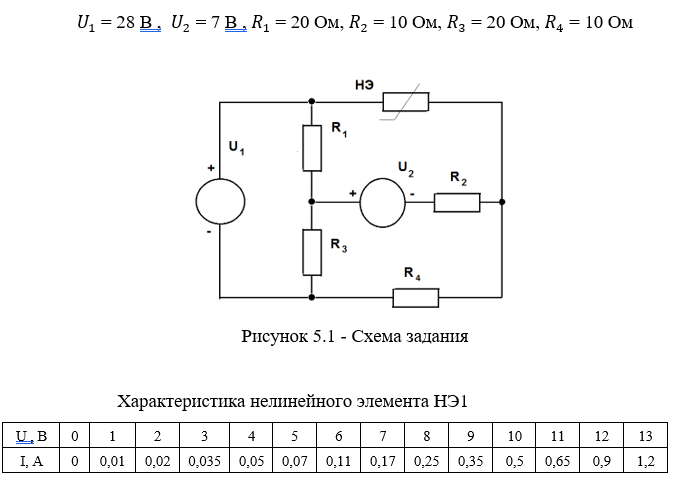 2. Нелинейные электрические цепи (вариант 55): = 28 B , = 7 B , = 20 Ом, = 10 Ом, = 20 Ом, = 10 Ом, схема 15. Характеристика нелинейного элемента НЭ1 представлена в таблице______________