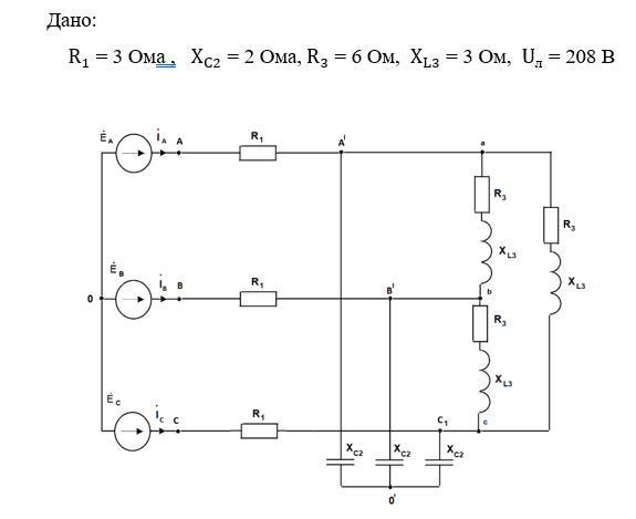 В трехфазной цепи синусоидального тока необходимо: 1) Определить токи и напряжения на всех участках цепи для симметричного режима. 2) Рассчитать суммарную активную мощность, потребляемую нагрузкой, и сравнить ее с мощностью трехфазного источника. 3) Повторить п. 1–2 для несимметричной нагрузки______
