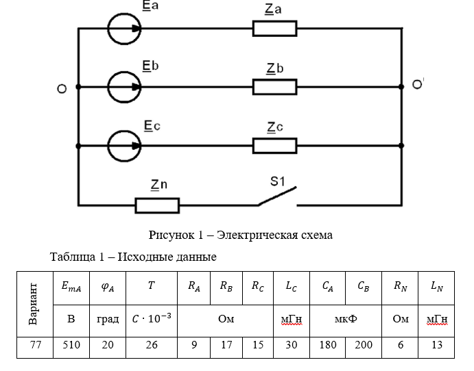 Параметры элементов электрической цепи по вариантам заданы в табл. 1. Поскольку генератор симметричный, то для него приведена амплитуда и начальная фаза только для фазы А, период функции Т. Параметры комплексной нагрузки для каждой фазы , , , а также комплексное сопротивление нулевого провода тоже показаны в табл. 1. Любое комплексное сопротивление Z, состоит из последовательно соединенных элементов в соответствии с заданным вариантом.