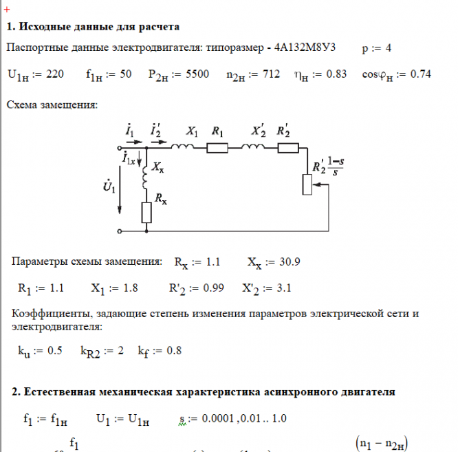 1 ДЗ, 68 Вариант "Расчет характеристик трехфазного асинхронного двигателя", выполненный Mathcad v15, нужно только распечатать, 2020г (препод Соловьев)