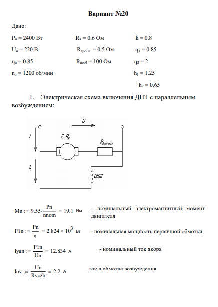 Вариант №20 Дано: Рн = 2400 Вт Rя = 0.6 Ом k = 0.8 Uн = 220 В Rдоб. п. = 0.5 Ом q1 = 0.85 ηн = 0.85 Rвозб = 100 Ом q2 = 2 nн = 1200 об/мин h1 = 1.25 h2 = 0.65