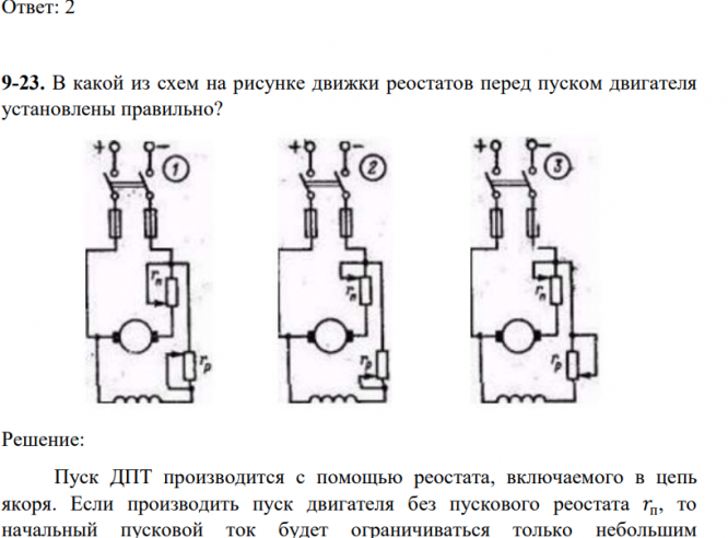 9-23. В какой из схем на рисунке движки реостатов перед пуском двигателя установлены правильно?