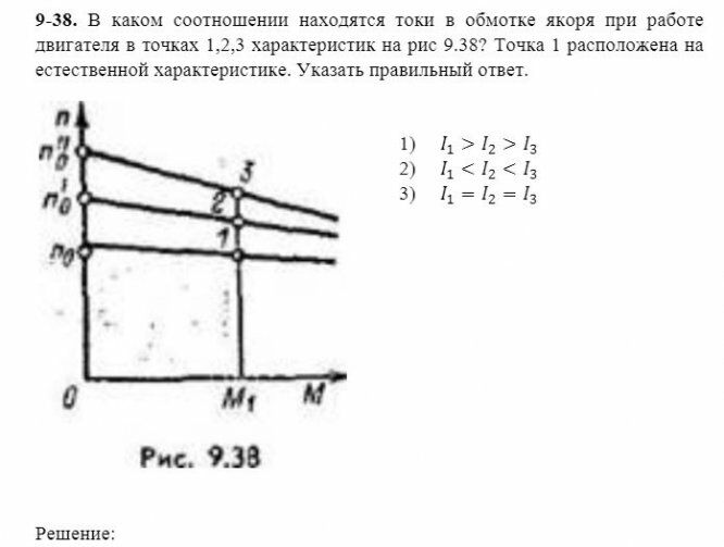 9-38. В каком соотношении находятся токи в обмотке якоря при работе двигателя в точках 1,2,3 характеристик на рис 9.38? Точка 1 расположена на естественной характеристике. Указать правильный ответ.