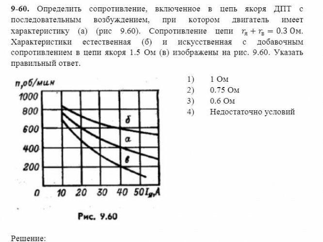 9-60. Определить сопротивление, включенное в цепь якоря ДПТ с последовательным возбуждением, при котором двигатель имеет характеристику (а) (рис 9.60). Сопротивление цепи. Характеристики естественная (б) и искусственная с добавочным сопротивлением в цепи якоря 1.5 Ом (в) изображены на рис. 9.60. Указать правильный ответ.