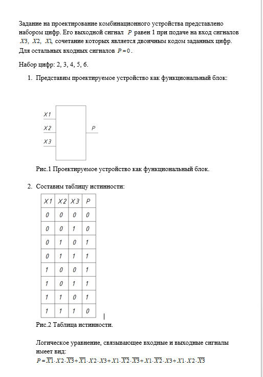 Задание на проектирование комбинационного устройства представлено набором цифр. Его выходной сигнал равен 1 при подаче на вход сигналов сочетание которых является двоичным кодом заданных цифр. Для остальных входных сигналов .