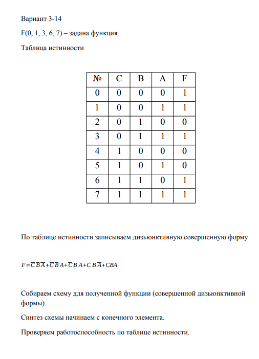 Вариант 3-14 F(0, 1, 3, 6, 7) – задана функция. Таблица истинности По таблице истинности записываем дизьюнктивную совершенную форму F=C B A+C B A+СB A+C B A+CBA Собираем схему для полученной функции (совершенной дизьюнктивной формы). Синтез схемы начинаем с конечного элемента. Проверяем работоспособность по таблице истинности
