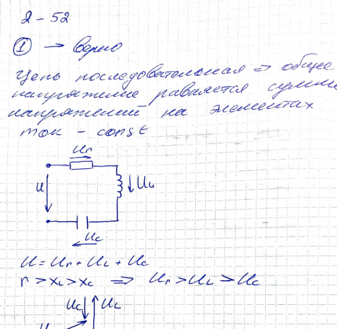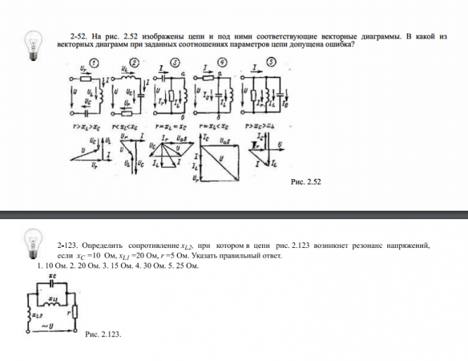 2-52. На рис. 2.52 изображены цепи и под ними соответствующие векторные диаграммы. В какой из векторных диаграмм при заданных соотношениях параметров цепи допущена ошибка?