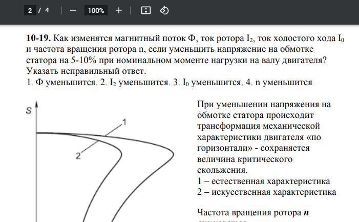 ​​​​10-19. Как изменятся магнитный поток Ф, ток ротора I2, ток холостого хода I0 и частота вращения ротора n, если уменьшить напряжение на обмотке статора на 5-10% при номинальном моменте нагрузки на валу двигателя? Указать неправильный ответ. 1. Ф уменьшится. 2. I2 уменьшится. 3. I0 уменьшится. 4. n уменьшится
