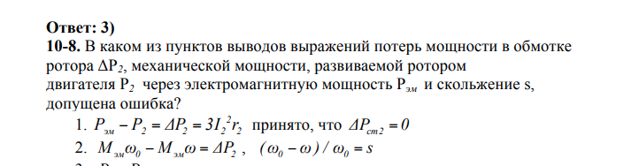 10-8. В каком из пунктов выводов выражений потерь мощности в обмотке ротора ΔP2, механической мощности, развиваемой ротором двигателя P2 через электромагнитную мощность Pэм и скольжение s, допущена ошибка?