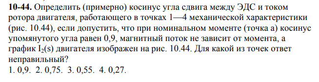 10-44. Определить (примерно) косинус угла сдвига между ЭДС и током ротора двигателя, работающего в точках 1—4 механической характеристики (рис. 10.44), если допустить, что при номинальном моменте (точка a) косинус упомянутого угла равен 0,9, магнитный поток не зависит от момента, а график I2(s) двигателя изображен на рис. 10.44. Для какой из точек ответ неправильный? 1. 0,9. 2. 0,75. 3. 0,55. 4. 0,27.