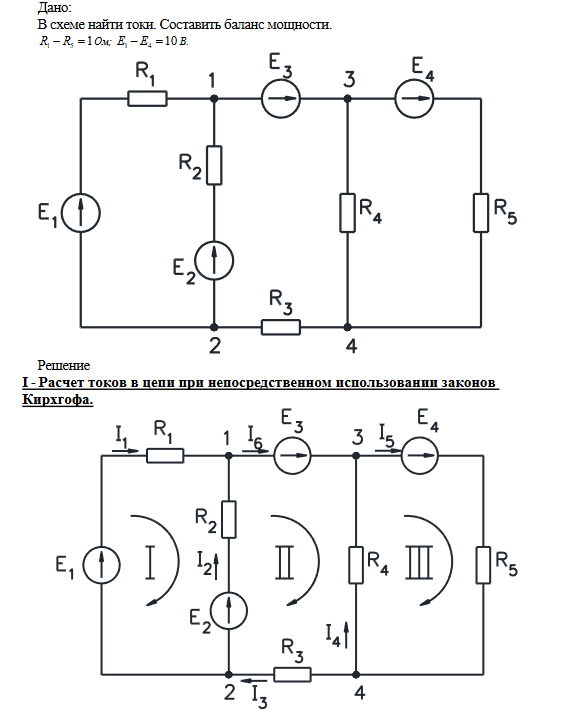 Дано: В схеме найти токи. Составить баланс мощности.151RR−=Ом; 1410EE−=В.Решение I-Расчет токов в цепи при непосредственном использовании законов Кирхгофа.Первый закон Кирхгофа: ∑±IK= 0