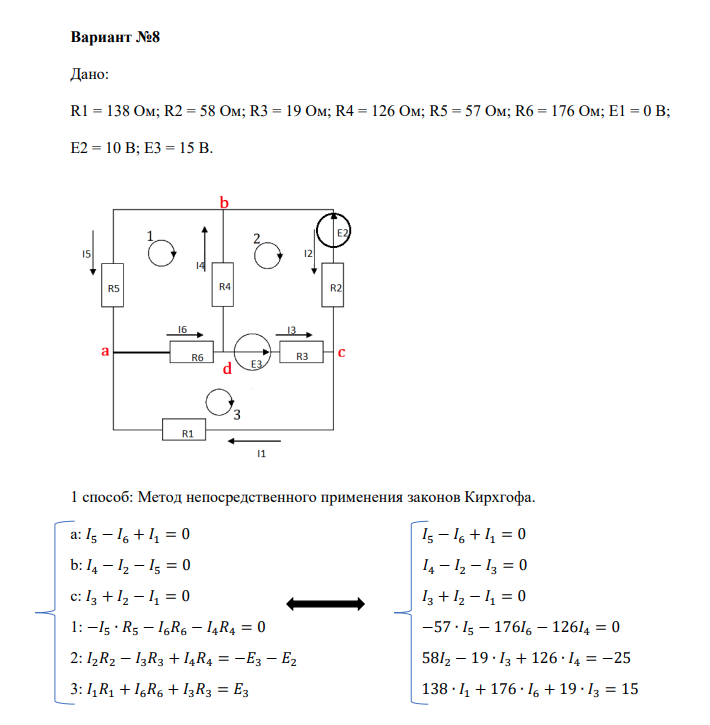 Вариант №8 Дано: R1 = 138 Ом; R2 = 58 Ом; R3 = 19 Ом; R4 = 126 Ом; R5 = 57 Ом; R6 = 176 Ом; E1 = 0 В; E2 = 10 В; E3 = 15 В