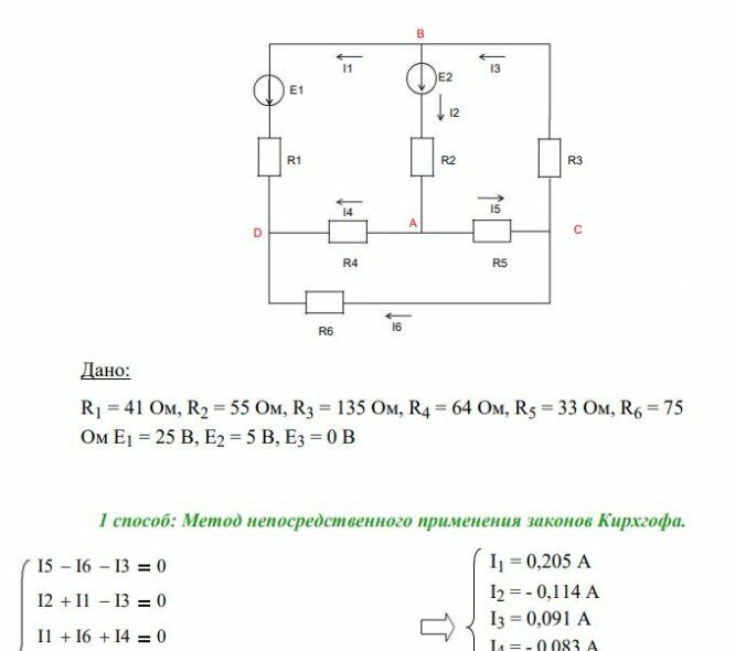 ​​​​Дано: R1 = 41 Ом, R2 = 55 Ом, R3 = 135 Ом, R4 = 64 Ом, R5 = 33 Ом, R6 = 75 Ом E1 = 25 В, E2 = 5 В, E3 = 0 В