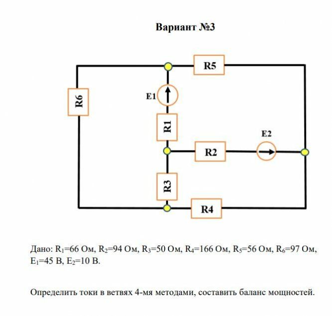 Cảm ơn bạn đã mua hàng 🥰🥰 🥰Cho: R1=66 Ohm, R2=94 Ohm, R3=50 Ohm, R4=166 Ohm, R5=56 Ohm, R6=97 Ohm, E1=45 V, E2=10 V. Xác định dòng điện trong các nhánh bằng 4 phương pháp, vẽ cân bằng công suất.