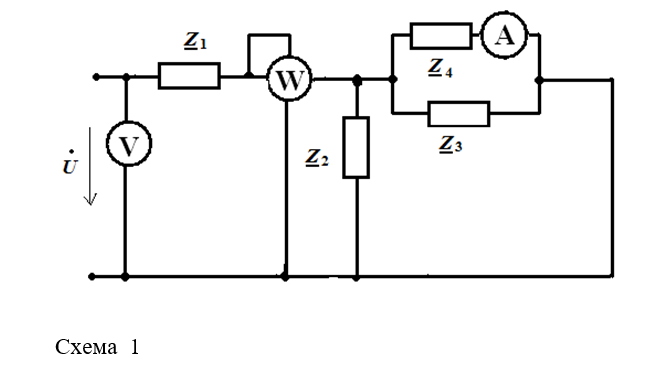 Z1=6 Ом, Z2=5+j3 Ом, Z3=j4 Ом, Z4=2 Ом, U=60 В.