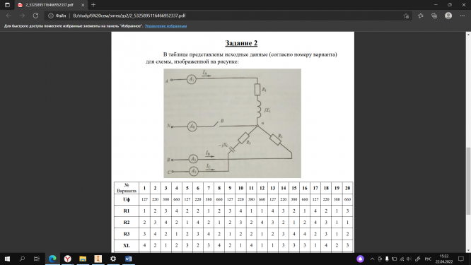 Используя эти данные, следует: написать выражения для мгновенных значений фазных напряжений на линии (в точках А, В и С) и на нагрузке; рассчитать: действующие значения токов в линейных проводах и нейтральном (нулевом) проводе, показания амперметровА1, А2, А3, А0 активную, реактивную и полную мощности каждой фазы нагрузки и всей трёхфазной системы. построить векторную диаграмму фазных и линейных напряжений и токов