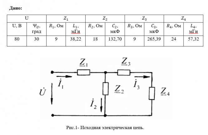 1. Используя символический метод для заданной схемы электрической цепи составить систему уравнений с помощью законов Кирхгофа, подставить в нее числовые значения, соответствующие рассматриваемому варианту задания, и определить все токи в ветвях схемы.