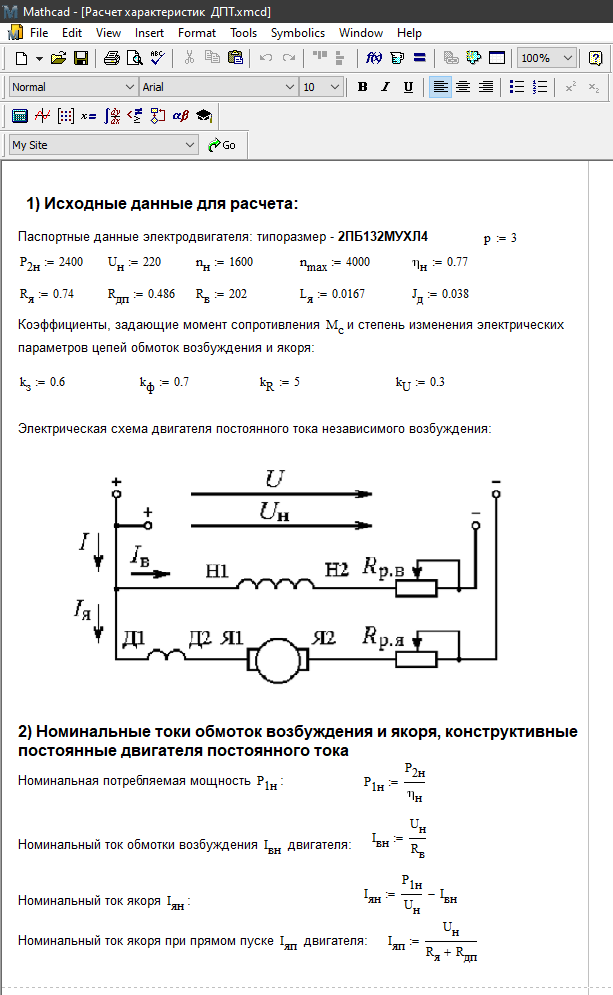 ДЗ №2 - Расчет механических и рабочих характеристик двигателя постоянного тока (Выполнено в MathCAD - универсально для всех вариантов)