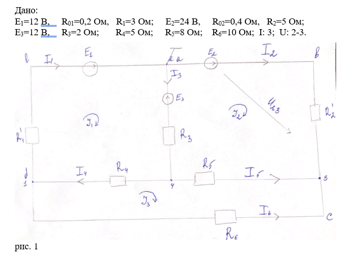 1) составить систему уравнений, необходимых для определения токов по первому и второму законам Кирхгофа;