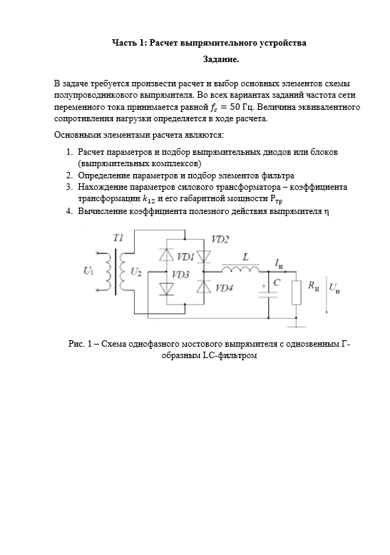1.) Расчет выпрямительного устройства - требуется произвести расчет и выбор основных элементов схемы полупроводникового выпрямителя.