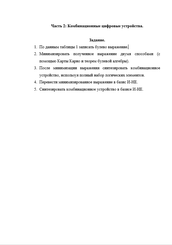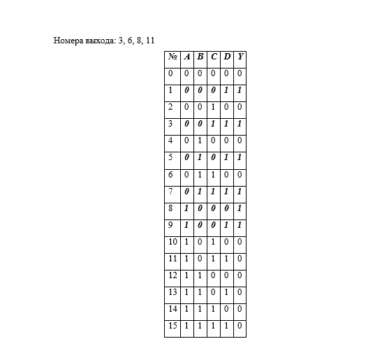 2.) Комбинационные цифровые устройства - требуется записать булево выражение по данным таблицы, минимизировать полученное выражение двумя способами (с помощью Карты Карно и теорем булевой алгебры), после минимизации выражения синтезировать комбинационное устройство, используя полный набор логических элементов, перевести минимизированное выражение в базис И-НЕ, синтезировать комбинационное устройство в базисе И-НЕ.
