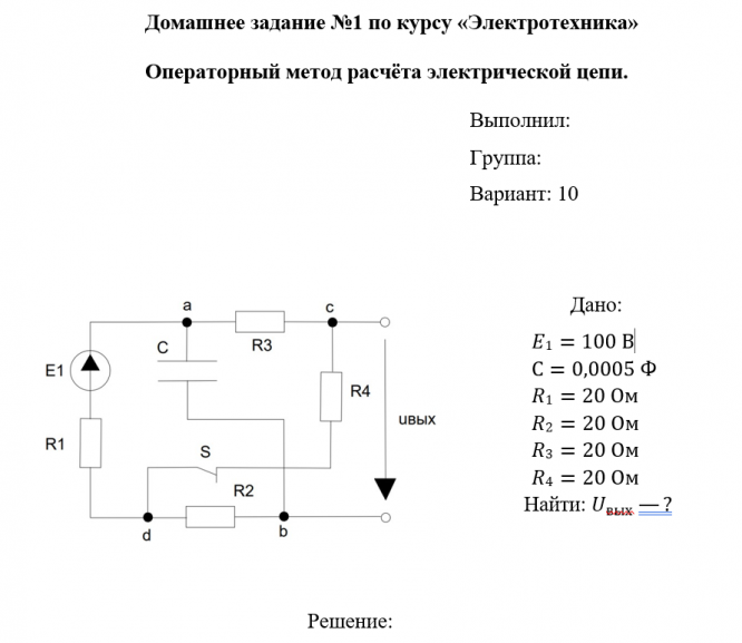 ДЗ 1: Операторный метод расчёта электрической цепи вариант 10