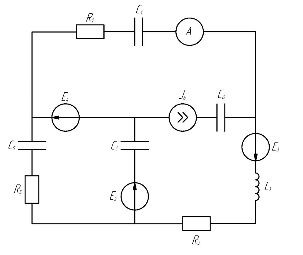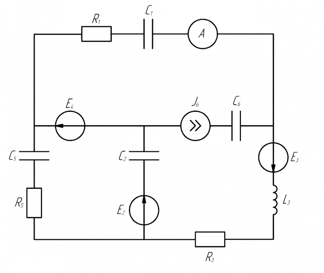 Единицы измерения: e [В], i [А], R [Ом], L [мГн], C [мкФ]. Начальная фаза эдс и токов источников указана в радианах.