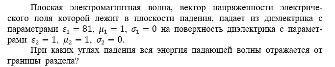 6. Плоская электромагнитная волна, вектор напряженности электрического поля которой лежит в плоскости падения, падает из диэлектрика с параметрами, на поверхность диэлектрика с параметрами.