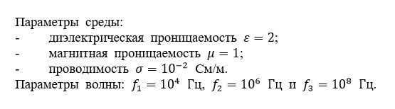 1. Плоская гармоническая линейно-поляризованная электромагнитная волна распространяется в среде с диэлектрической проницаемостью, магнитной проницаемостью и проводимостью.