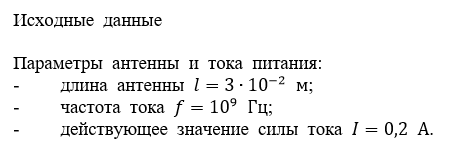 4. Электрическая антенна в виде линейного провода длиной питается переменным током частоты. Действующее значение тока. Вычислить сопротивление и мощность излучения антенны. Диэлектриком является воздух.