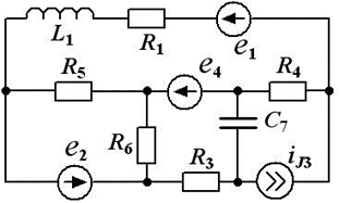 Рассчитать токи в заданной схеме методом контурных токов, методом узловых потенциалов и неизвестный ток в одной из ветвей методом эквивалентного источника. Единицы измерения: e [В], i [А], R [Ом], L [мГн], C [мкФ].Для заданной схемы составить уравнения по законам Кирхгофа во временной и комплексной формах. Рассчитать токи и определить показания приборов. Построить векторную диаграмму токов для одного из узлов. В ответе указать значения токов в комплексной и во временной формах. Единицы измерения: e [В], i [А], R [Ом], L [мГн], C [мкФ]..