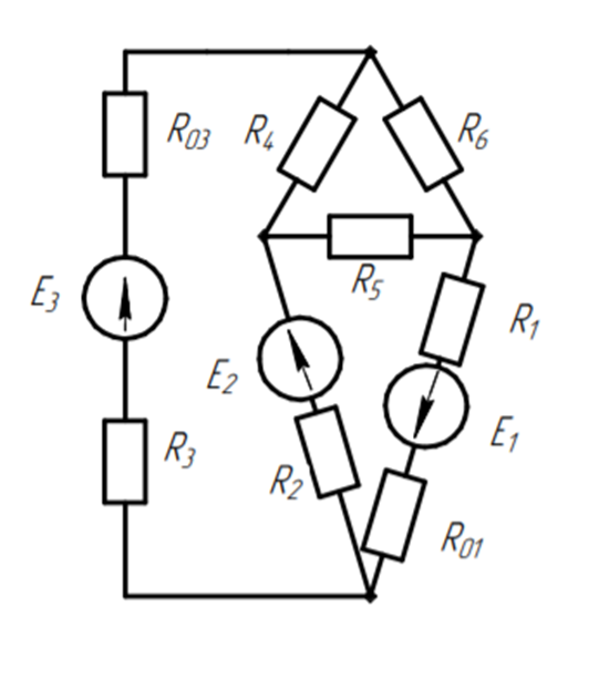 - Для заданной схемы (Рис. 1) составить систему уравнений по законам Кирхгофа, подставить в нее числовые значения (Таблица 1), и определить все токи в ветвях схемы.