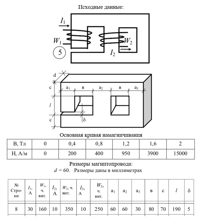 Заданы размеры магнитной цепи, кривая намагничивания представлена в табл. 4.1. Величины токов и числа витков обмоток и геометрические размеры заданы в табл. 4.2. Определить магнитные потоки в стержнях и значение магнитной индукции в воздушном зазоре. При расчете потоками рассеяния пренебречь.