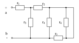 Заданы все сопротивления и напряжения Uab. Требуется: Найти общее сопротивление схемы относительно зажимов a-b Определить токи во всех ветвях. Дано: Uab = 80 В, r1 = 4 Ом, r2 = 5 Ом, r3 = 3 Ом, r4 = 2 Ом, r5 = 6 Ом, r 6 = 6 Ом