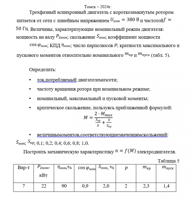 Трехфазный асинхронный двигатель с короткозамкнутым ротором питается от сети с линейным напряжением и частотой. Величины, характеризующие номинальный режим двигателя: мощность на валу ; скольжение ; коэффициент мощности; КПД ; число пар полюсов ; кратности максимального и пускового моментов относительно номинального и (табл. 5).