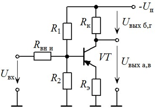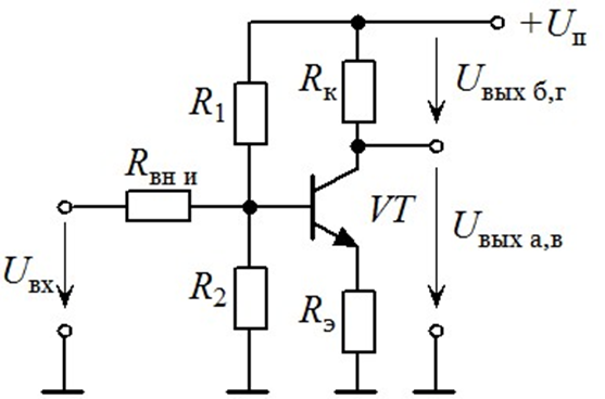 - Рассчитать номиналы резисторов и входное напряжение (Uвх), которое нужно подать на схему, чтобы обеспечить заданное напряжение на выходе (для вариантов «а», «в» - Uвых а, в, для вариантов «б», «г» - Uвых б, г).