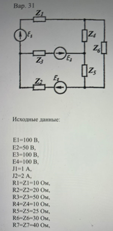 Домашнее задание № 1 по курсу «Электротехника». Для заданной схемы: 1. Найти токи всех ветвей методом уравнений Кирхгофа. 2. Найти токи всех ветвей методом контурных токов. 3. Найти токи всех ветвей методом узловых потенциалов. 4. Сравнить результаты, полученные в п. 1, 2 и 3; сравнение результатов представить в виде таблицы. 5. Найти проводимость и ток эквивалентного источника тока, подключенного к отмеченному в таблице сопротивлению R, по теореме Нортона. Найти ток через отмеченное в таблице сопротивление R, подключенное к эквивалентному источнику тока. 6. Найти сопротивление и напряжение эквивалентного источника напряжения, подключенного к отмеченному в таблице сопротивлению R, по теореме Тевенина. Найти ток через отмеченное в таблице сопротивление R, подключенное к эквивалентному источнику напряжения. 7. Сравнить ток в отмеченном в таблице сопротивлении R с результатами по п. 4. 8. Рассчитать баланс мощности.