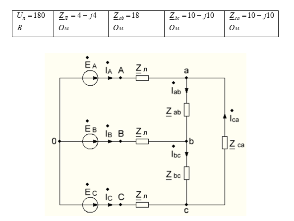 Необходимо рассчитать напряжения на фазах нагрузки, токи в фазах нагрузки и линии и построить векторную топографическую диаграмму напряжений, совмещённую с векторной диаграммой токов.