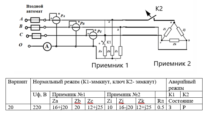 ДЗ 2: Расчет разветвленных трехфазных цепей синусоидального тока. вариант 20