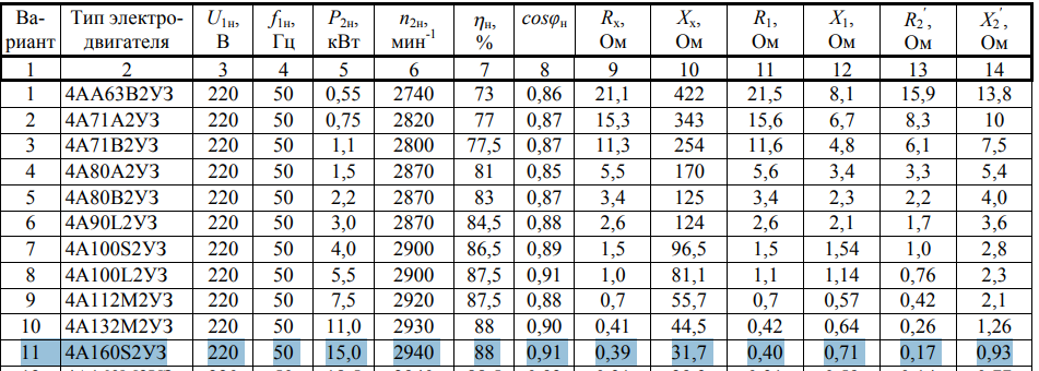 ДЗ 1: Расчёт характеристик трёхфазного асинхронного двигателя вариант 11
