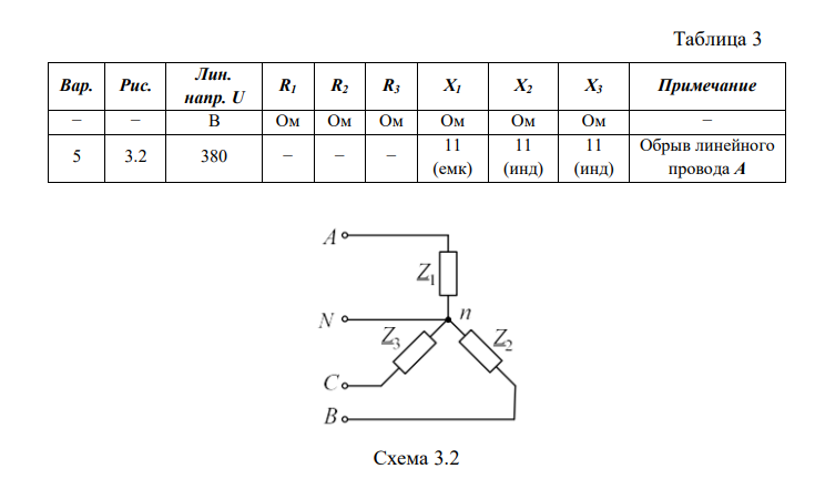 Для электрической цепи, изображенной на рис. 3.2, по заданным параметрам трехфазной симметричной нагрузки 𝑍𝑘 = 𝑅𝑘 ± 𝑗𝑋𝑘 и линейному напряжению источника электрической цепи (табл. 3):