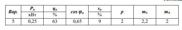 Трехфазный асинхронный двигатель с короткозамкнутым ротором питается от сети с линейным напряжением 380 В и частотой f = 50 Гц. Величины, характеризующие номинальный режим двигателя: мощность на валу Pн; скольжение sн; коэффициент мощности cos φн; КПД ηн; число пар полюсов p; кратности максимального и пускового моментов относительно номинального mк и mп (таблица 1).