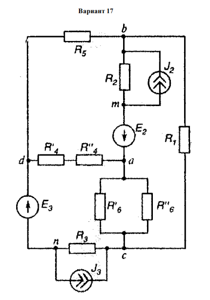 Задавая самостоятельно значения параметров исходной схемы (сопротивления резистивных элементов, ЭДС источников и токи источников), написать скрипт, вычисляющий: токи ветвей (решение уравнений п.2); контурные токи (решение уравнений п.3); потенциалы узлов (решение уравнений п.4); мощность, доставляемую в цепь источниками и мощность, потребляемую резисторами (для преобразованной и исходной схемы, п.6). Подтвердить правильность вычислений п.7 непосредственным моделированием средствами подсистемы физического моделирования. Реализовать программно построение потенциальных диаграмм для всех независимых контуров (для преобразованной и исходной схемы).Выполнить эквивалентные преобразования исходной схемы (варианты 1 – 20).