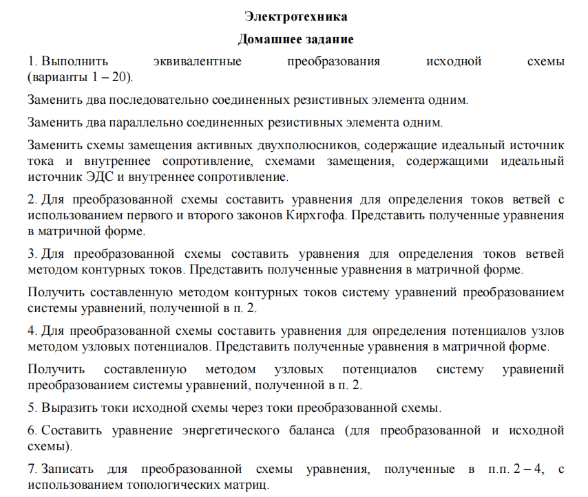 Представить полученные уравнения в матричной форме. Получить составленную методом контурных токов систему уравнений преобразованием системы уравнений, полученной при выполнении п.2. Для преобразованной схемы составить уравнения для определения потенциалов узлов методом узловых потенциалов. Представить полученные уравнения в матричной форме. Получить составленную методом узловых потенциалов систему уравнений преобразованием системы уравнений, полученной при выполнении п.2. Записать в общем виде выражения для токов ветвей и потенциалов узлов. Допускается использование промежуточных обозначений. Составить уравнение энергетического баланса (для преобразованной и исходной схемы).