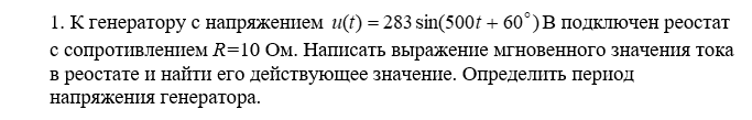 1. К генератору с напряжением В подключен реостат с сопротивлением R=10 Ом. Написать выражение мгновенного значения тока в реостате и найти его действующее значение. Определить период напряжения генератора.
