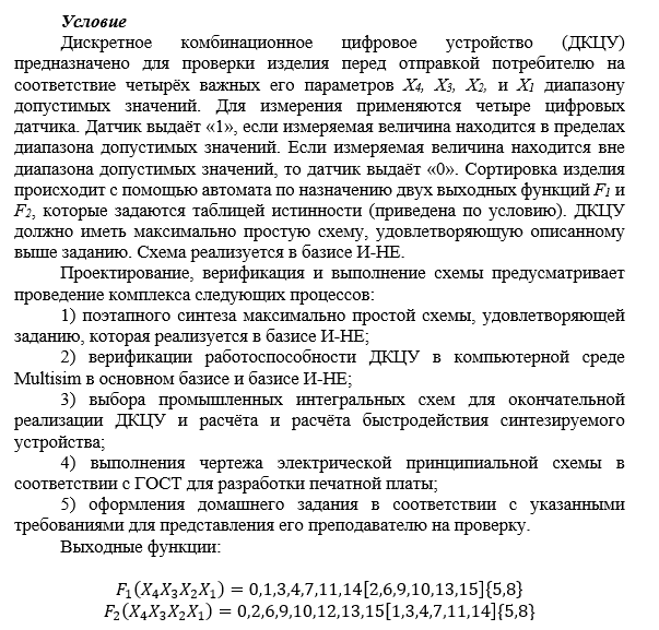 Главная » Учебные материалы » Электротехника (ЭлТех) » Домашние задания » МГТУ им. Н.Э.Баумана » 7 семестр » Номер 1 » Вариант 57 » Проектирование дискретного комбинационного цифрового устройства на интегральных микросхемах