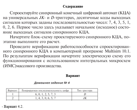 Главная » Учебные материалы » Электротехника (ЭлТех) » Домашние задания » МГТУ им. Н.Э.Баумана » 7 семестр » Номер 2 » Вариант 77 » Синтез синхронного автомата на универсальных JK- и D-триггерах