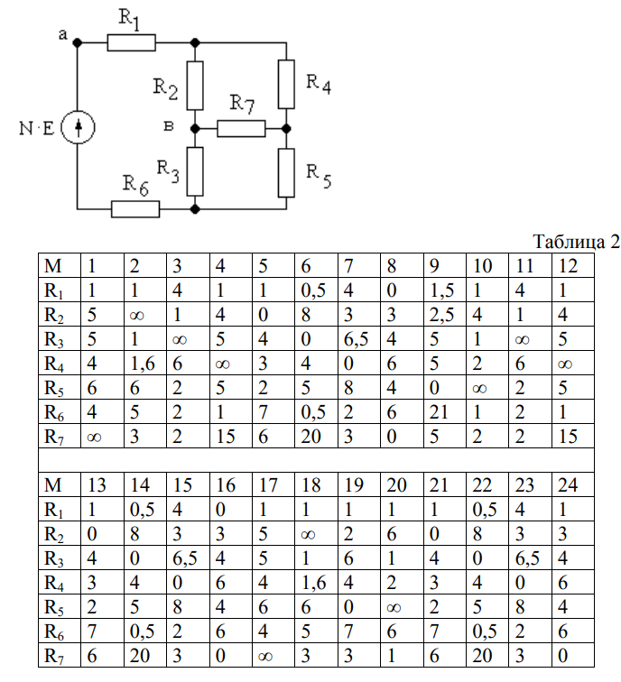Задача 17. В заданной схеме найти токи в ветвях и напряжение Uав, если Е = 10 В. Значения всех сопротивлений (в омах) указаны в таблице 2.